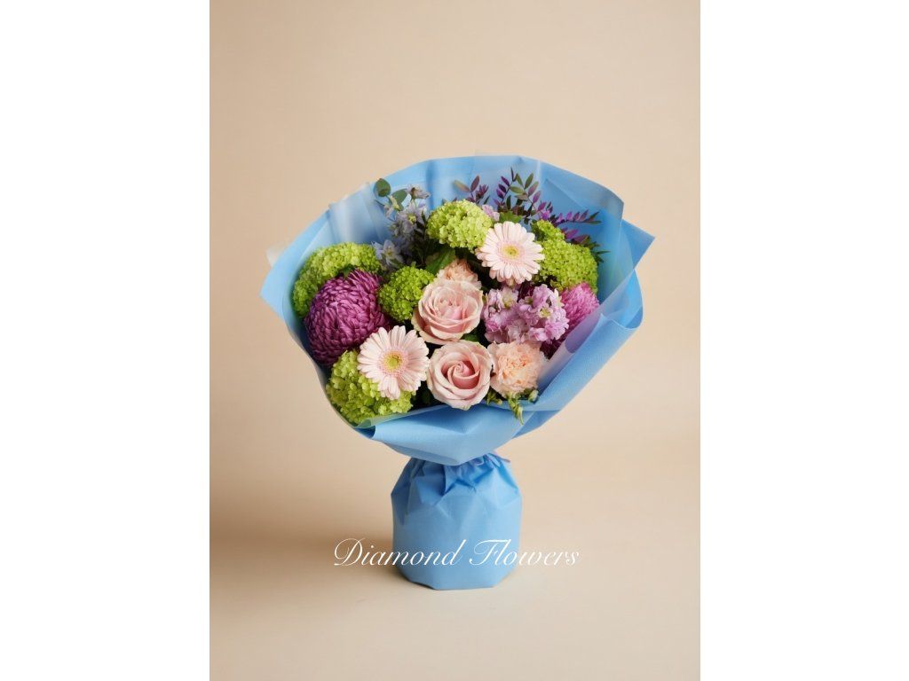Barevná kytice gerber a chryzantém vyniká svěží kombinací jemných pastelových odstínů a bohaté zeleně. Elegantní modré balení dodává aranžmá moderní a zároveň něžný vzhled. Ideální dárek pro radostné příležitosti, který potěší svou lehkostí a harmonií barev.