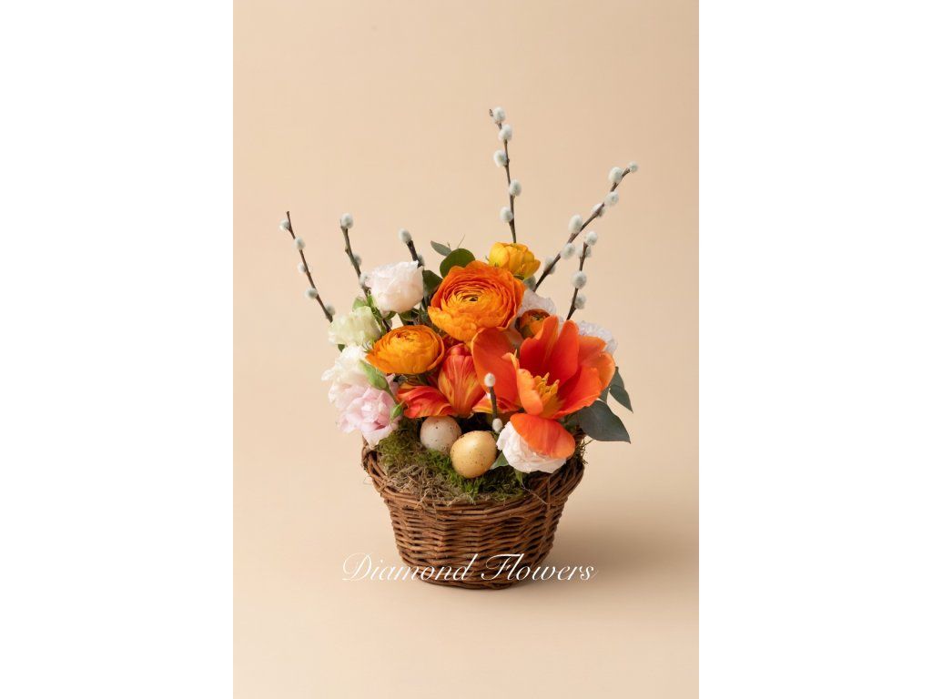 Tento barevný velikonoční košík je plný zářivých tulipánů a něžných ranunkulů, které mu dodávají svěží jarní vzhled. Díky pečlivému výběru květin vás bude tato dekorace těšit svou krásou po dlouhou dobu. Přinese radost a jarní atmosféru do každého domova.