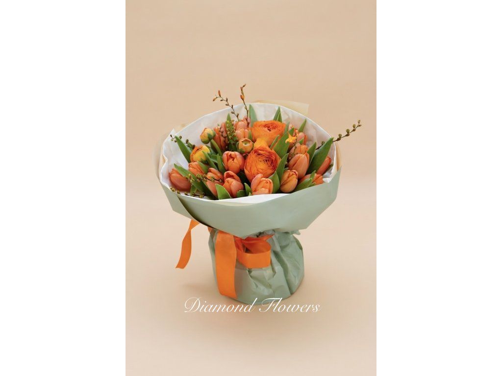 Elegantní kytice s oranžovými ranunkuly zaujme svou teplou a energickou barevností. Jemné květy doplněné tulipány a zelení vytvářejí svěží a moderní kompozici. Ideální volba pro radostné příležitosti, kdy chcete darovat optimismus a dobrou náladu.
