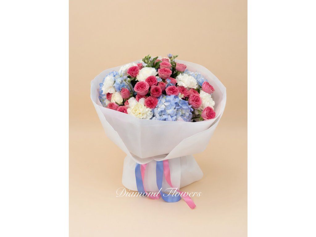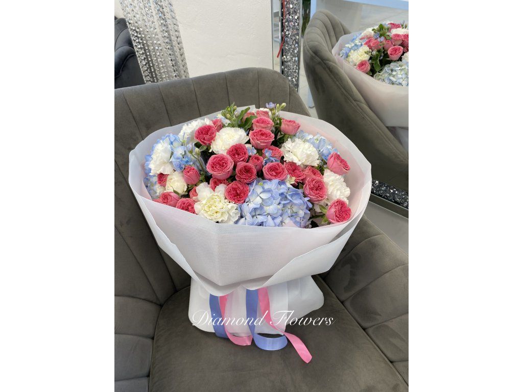 Kytice hortenzie a růže okouzlí jemnou kombinací pastelových barev a bohatých květů. Spojení růžových růží s modrými hortenziemi vytváří romantickou a elegantní kompozici. Ideální dárek pro chvíle, kdy chcete vyjádřit něhu, radost a vkus.