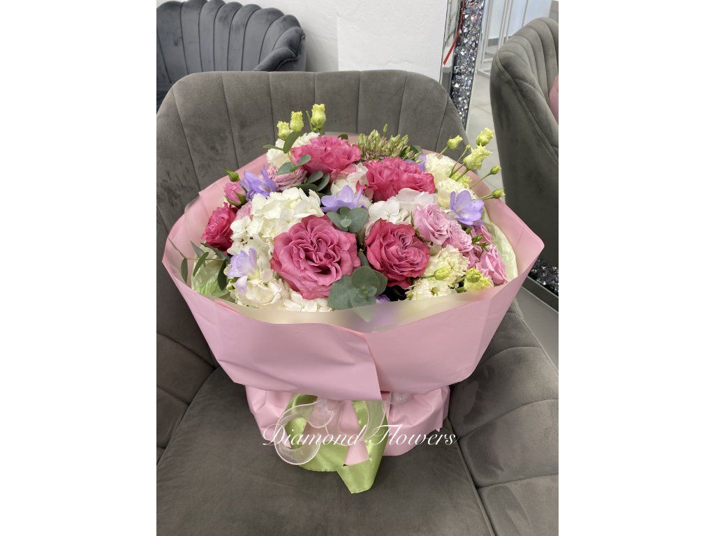 Jarní kytice potěší svěží kombinací barevných květů a jemných pastelových tónů. Růže, hortenzie a drobné kvítky společně vytvářejí lehkou a radostnou kompozici plnou života. Ideální dárek pro přivítání jara nebo pro zpříjemnění každého dne.