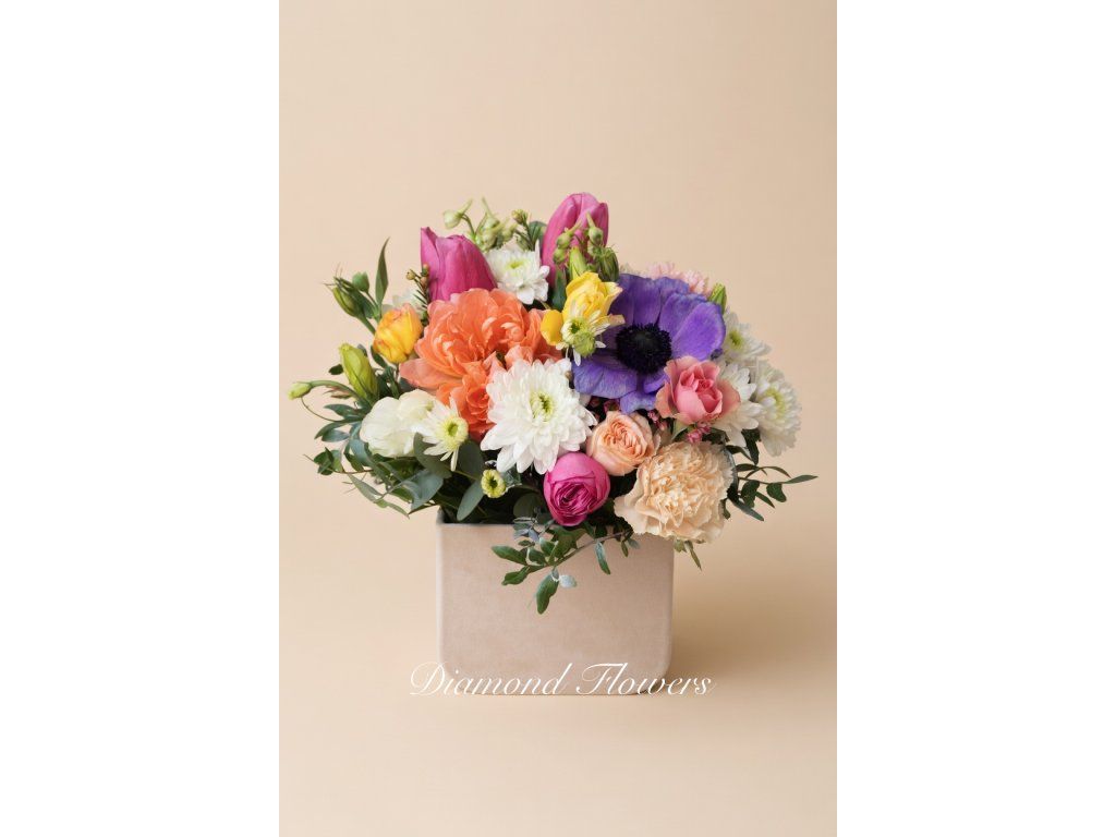 Jemná květinová kompozice zaujme pestrou paletou barev a harmonickým uspořádáním květů. Spojení růží, sasanky a sezónních květin vytváří elegantní a svěží aranžmá. Ideální dárek pro každou příležitost, kdy chcete potěšit jemností a krásou.