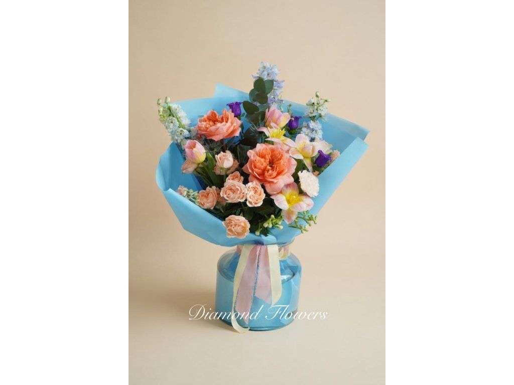 Kombinace růží, tulipánů a delfinia zaujme pestrou paletou barev a svěží jarní energií. Jemné růže a tulipány doplněné výrazným delfiniem vytvářejí harmonickou a elegantní kompozici. Ideální dárek pro radostné příležitosti, který přinese lehkost a dobrou náladu.