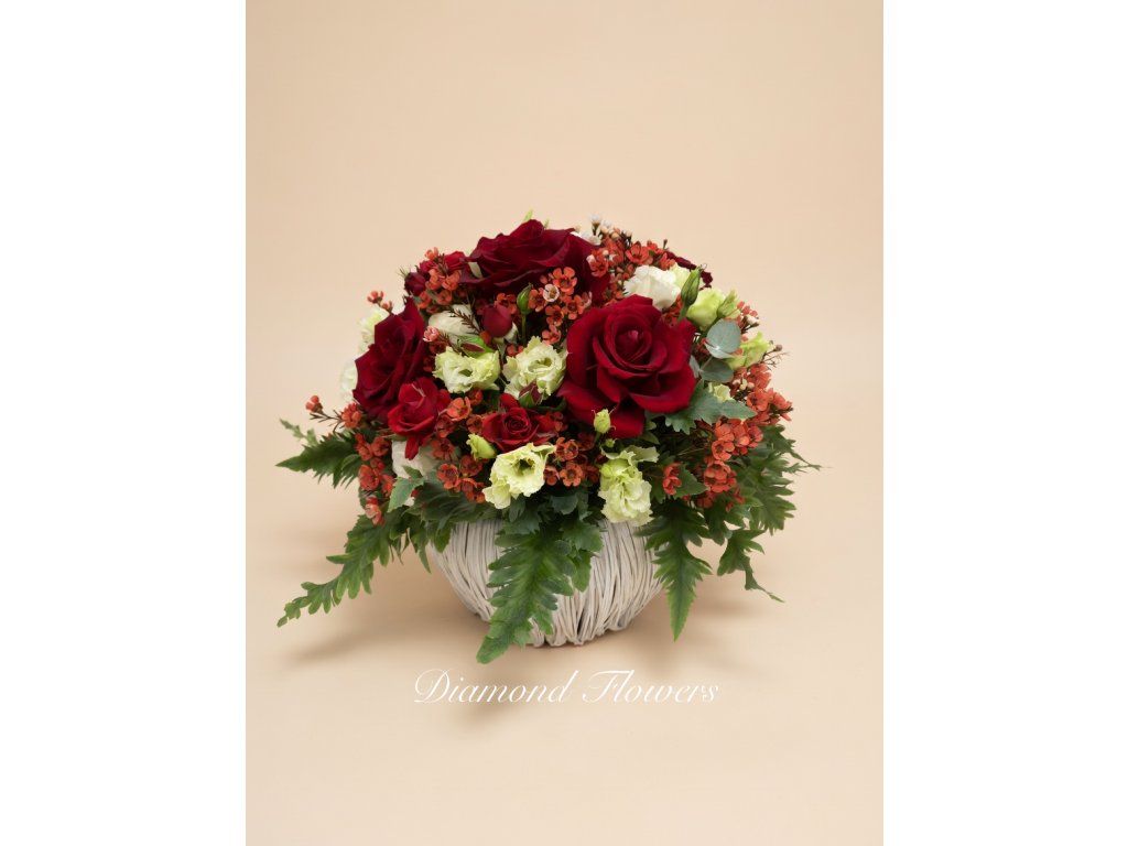 Květinové aranžmá v bílém košíku zaujme elegantní kombinací červených růží a jemných doplňkových květů. Bohatá zeleň dodává kompozici svěžest a přirozený vzhled. Ideální dekorace nebo dárek, který vyjadřuje vášeň, styl a vkus.