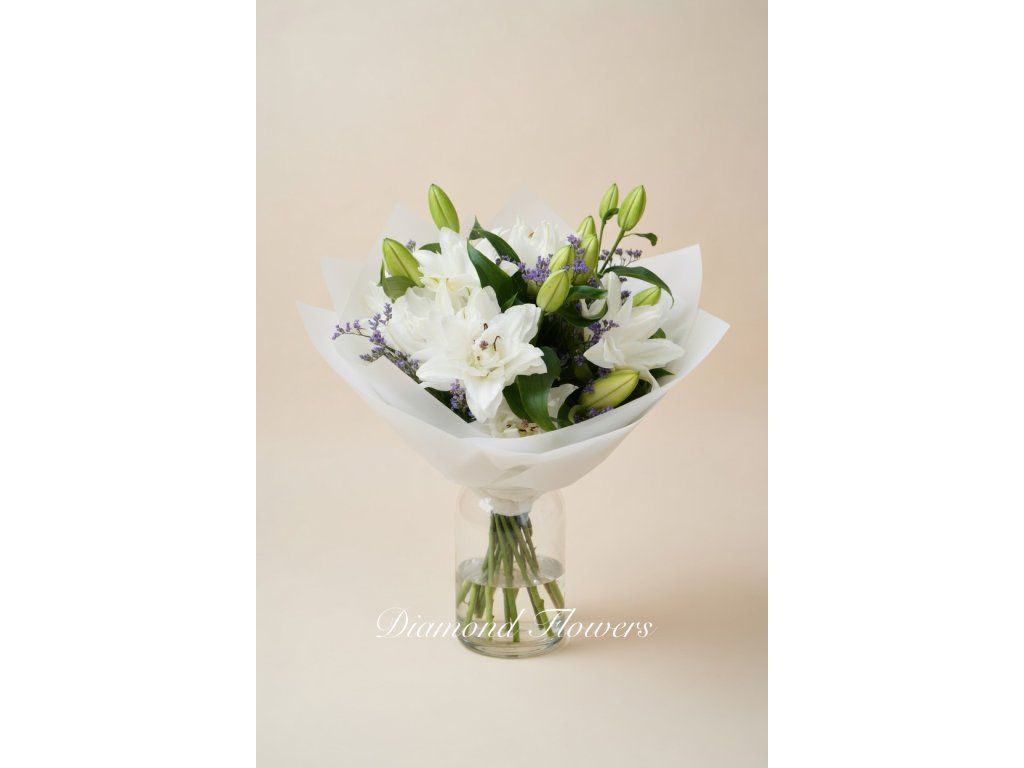 Kytice s lilií a levandulí okouzlí svou čistotou a jemnou vůní. Bílé lilie v kombinaci s levandulovými tóny vytvářejí elegantní a uklidňující kompozici. Ideální volba pro chvíle, kdy chcete darovat klid, harmonii a přirozenou krásu.