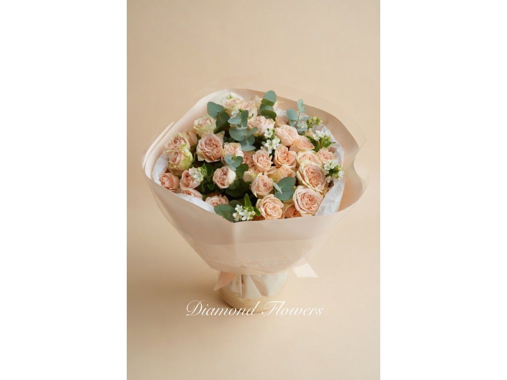Luxusní kytice krémových sprejových růží zaujme svou jemností a sofistikovaným vzhledem. Drobné květy v krémových tónech doplněné eukalyptem vytvářejí elegantní a harmonickou kompozici. Ideální dárek pro vyjádření něhy, vkusu a nadčasové elegance.