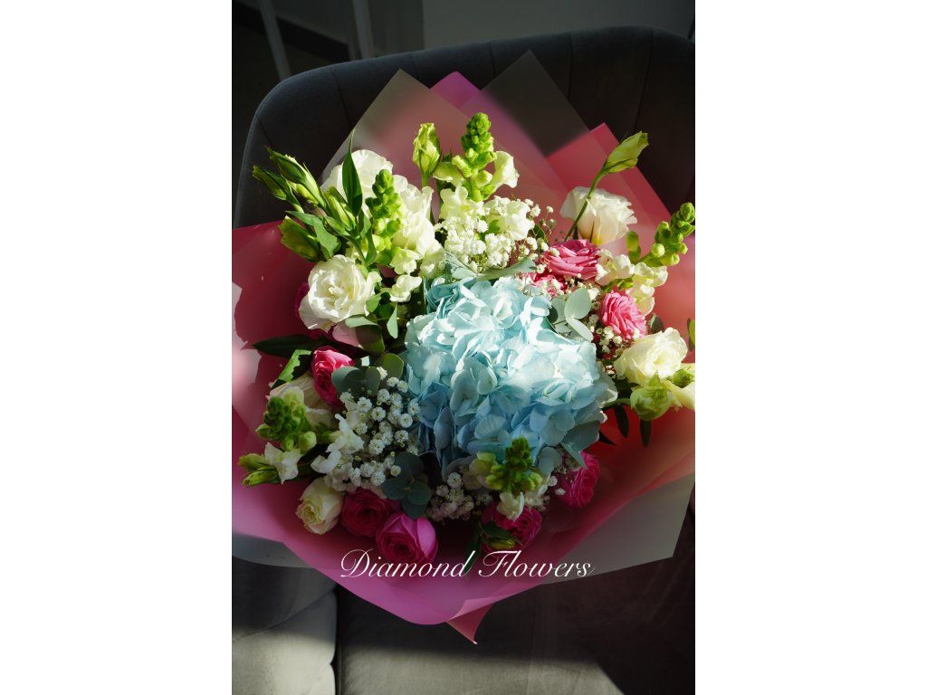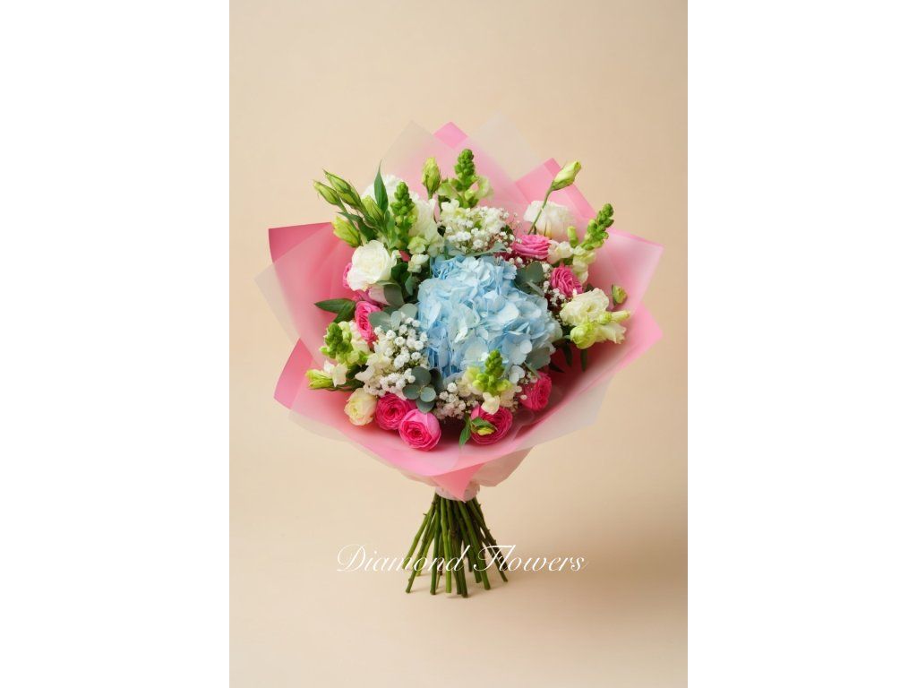 Luxusní kytice s modrou hortenzií zaujme svou výraznou barvou a elegantní kompozicí. Dominantní hortenzie doplněná růžemi a jemnými květy vytváří harmonický a svěží celek. Ideální dárek pro výjimečné příležitosti, kdy chcete zapůsobit stylem a originalitou.