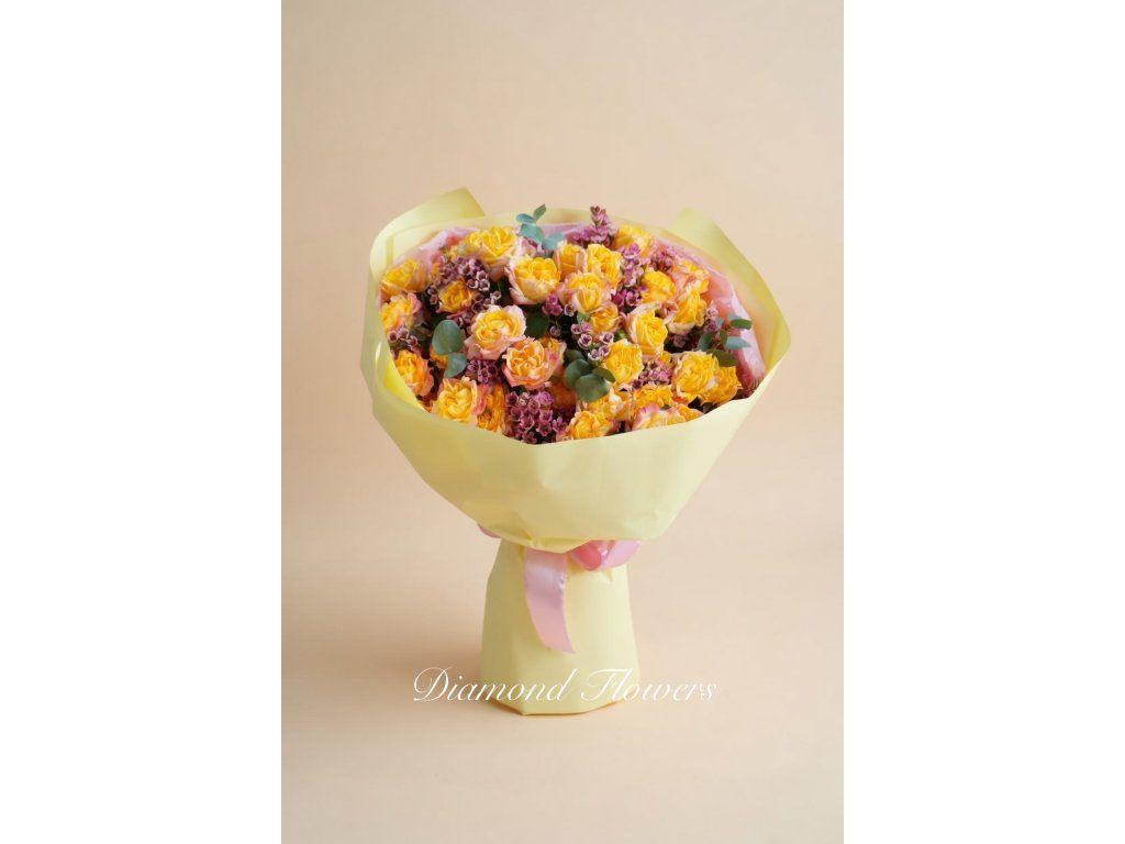 Luxusní kytice žlutých sprejových růží září radostí a pozitivní energií. Drobné květy v teplých žlutých tónech vytvářejí bohatou a veselou kompozici. Ideální dárek pro zpříjemnění dne a vyjádření přátelství či vděčnosti.