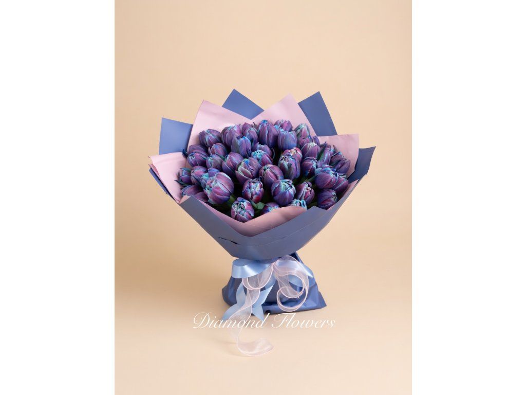 Pivoňkový tulipán barevné 51 ks zaujme svou plností a neobvyklým, elegantním vzhledem květů. Bohatá kytice v hlubokých fialovo-modrých odstínech působí luxusně a výjimečně. Ideální dárek pro speciální příležitosti, kdy chcete opravdu zapůsobit.