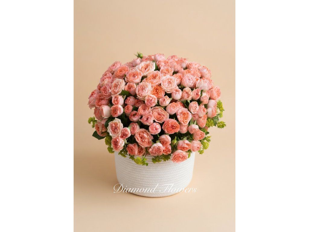 Romantické sprejové růže v bílém košíku okouzlí svou bohatostí a jemnými růžovými odstíny. Drobné květy vytvářejí plnou a elegantní kompozici plnou něhy. Ideální dárek pro romantické chvíle, kdy chcete vyjádřit lásku a obdiv s lehkostí a stylem.