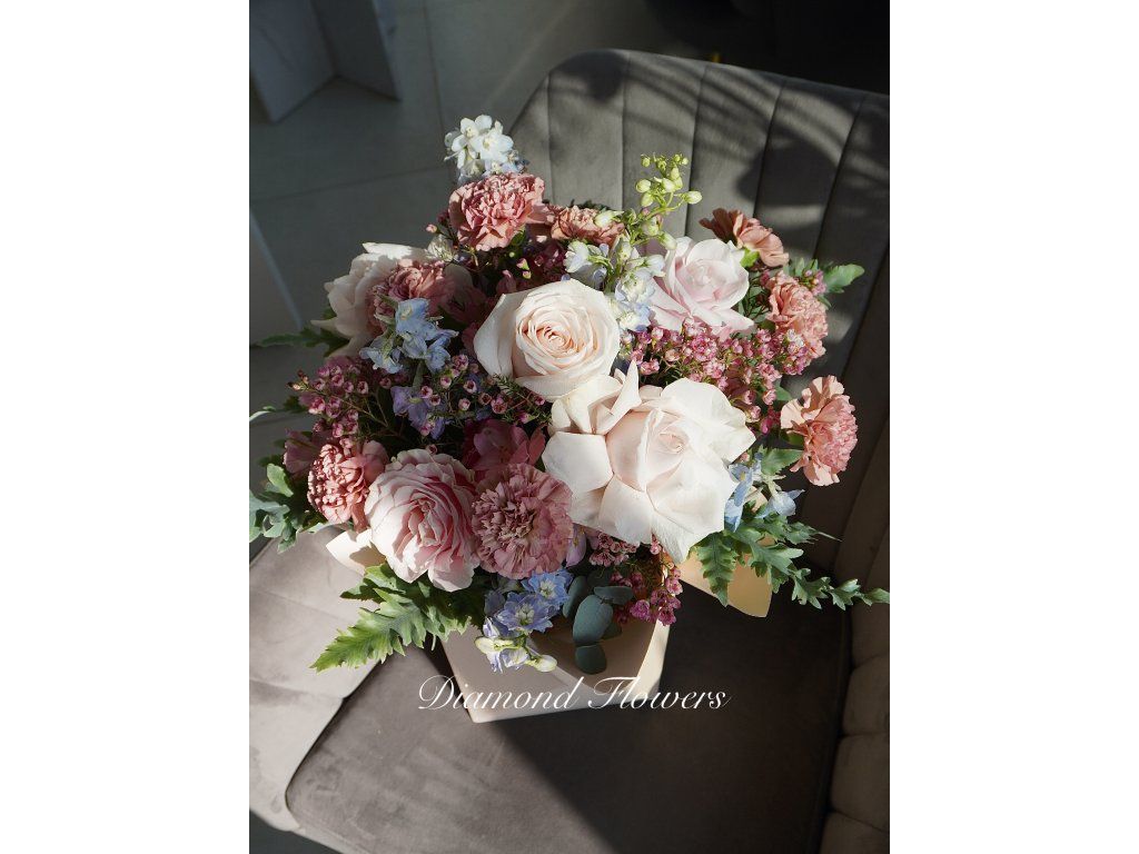 Romantický sen v sametové krabičce okouzlí jemnou kombinací pastelových květů a elegantním aranžmá. Růže a sezónní květiny vytvářejí bohatou, něžnou kompozici plnou harmonie. Ideální dárek pro výjimečné chvíle, kdy chcete vyjádřit lásku a něhu s nádechem luxusu.