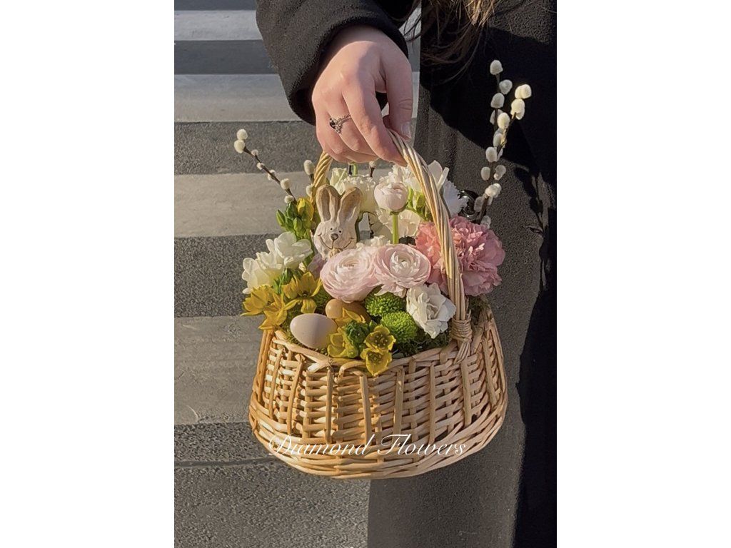 Velikonoční košíček vás bude těšit ještě dlouho po svátcích svou jemnou a veselou atmosférou. Najdete v něm něžné ranunkuly, karafiáty a roztomilého keramického králíčka, který dodává celé dekoraci kouzlo. Je to ideální jarní ozdoba do interiéru nebo milý dárek pro vaše blízké.
